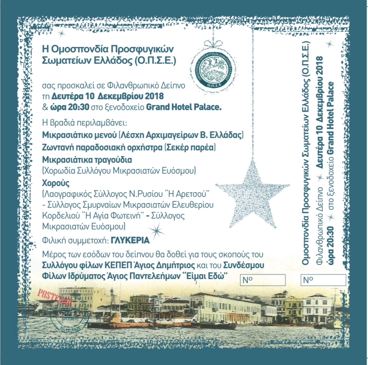 A completely successful charity evening was held in collaboration with the Federation of Refugee Associations of Greece for the purposes of the Friends of KEPEP Agios Dimitrios and Agios Panteleimon Foundation “Eimai Edo” at the Grand Hotel Palace.